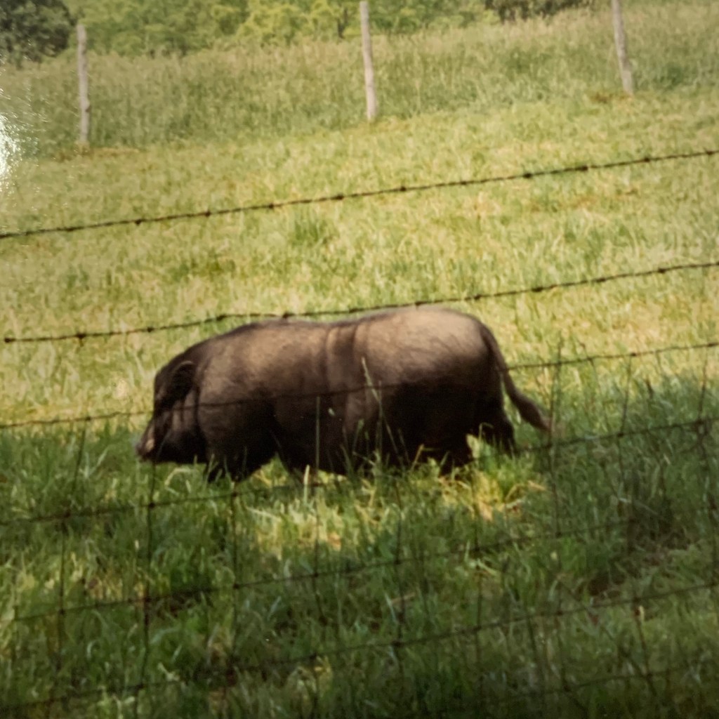 I’ll never forget the day as a teen that our elderly neighbors drove up to our house and asked if we could come help them. As they had driven into the pasture to feed their cows that day, there was a wild boar running around with the cows and they were afraid to get out of the vehicle! Let me tell you, this was the kind of adventure my family lived for! My brother and I with my dad and my Uncle Kevin jumped in the truck and drove straight over. Sure enough, there was a pig, tusks and everything, running around with the cows like he owned the place. Our best guess is that since this was the early 90’s and pot-bellied pigs were all the rage, that someone’s cute little pet had grown up too big, and they had dumped him beside a road somewhere. He had figured out that where cows were, grain soon followed, and here he was.